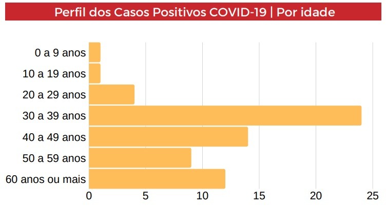 Dentre os pacientes positivos para a Covid-19, cerca de 56.9% são mulheres e 43.1% homens. A maioria dos casos confirmados para o novo coronavírus estão na faixa etária de 30-39 anos de idade. Em segundo no ranking estão as pessoas de 40 a 49 anos de idade seguido dos com 60 anos ou mais.