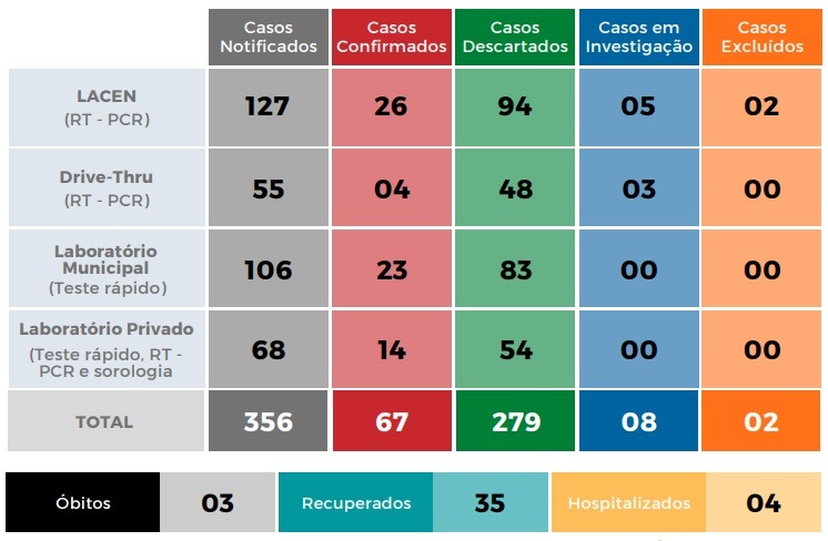 Com isso, sobe para 67 o número de casos positivos no Município. Ainda assim, 35 pessoas com o novo coronavírus foram recuperadas e 8 casos aguardam resultado dos exames. O sistema de Drive Thru até o momento registraram 55 casos suspeitos e desse número apenas 4 deram positivos para a Covid-19.