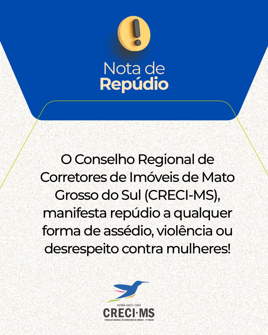 O Conselho Regional de Corretores de Imóveis de Mato Grosso do Sul (CRECI-MS) divulgou nota pública reforçando seu repúdio a qualquer forma de assédio, violência ou desrespeito contra mulheres, após um corretor de imóveis ser conduzido à DEPAC de Três Lagoas na quarta-feira, 12, acusado de injúria e agressão contra uma jovem de 25 anos em uma padaria na Avenida Filinto Müller.