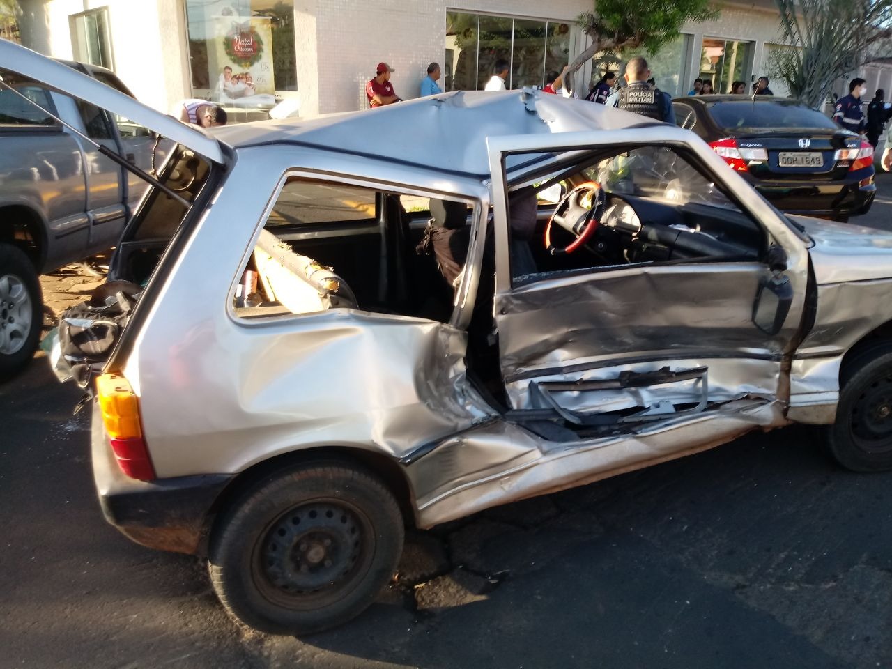 Com a violência do impacto o Fiat Uno foi arremessado para a calçada e por pouco não invadiu uma loja. No porta-malas do veículo tinha uma lata de tinta que com a força da colisão explodiu e sujou um carro que estava estacionado.