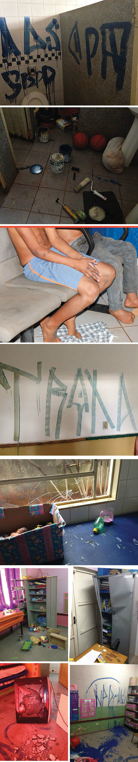 Eles foram flagrados com uma faca, tinta e cola e disseram que iriam fazer pipa com o material. Além de jogarem tinta no chão das salas e quebrarem armários móveis e objetos, os menores derrubaram uma TV no chão.