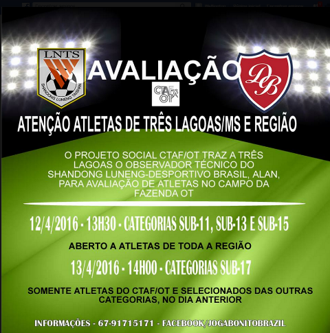 O CTAF(Centro De Treinamento Avançado De Futebol) de Três Lagoas (MS) iria receber nesta terça-feira (12), o observador Alan Costa, representante do clube Shandong Luneng (DB) para visita técnica (Avaliação ) inédita na região. A avaliação foi transferida para quarta-feira (13).