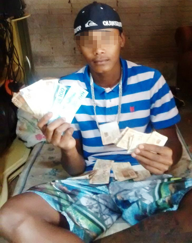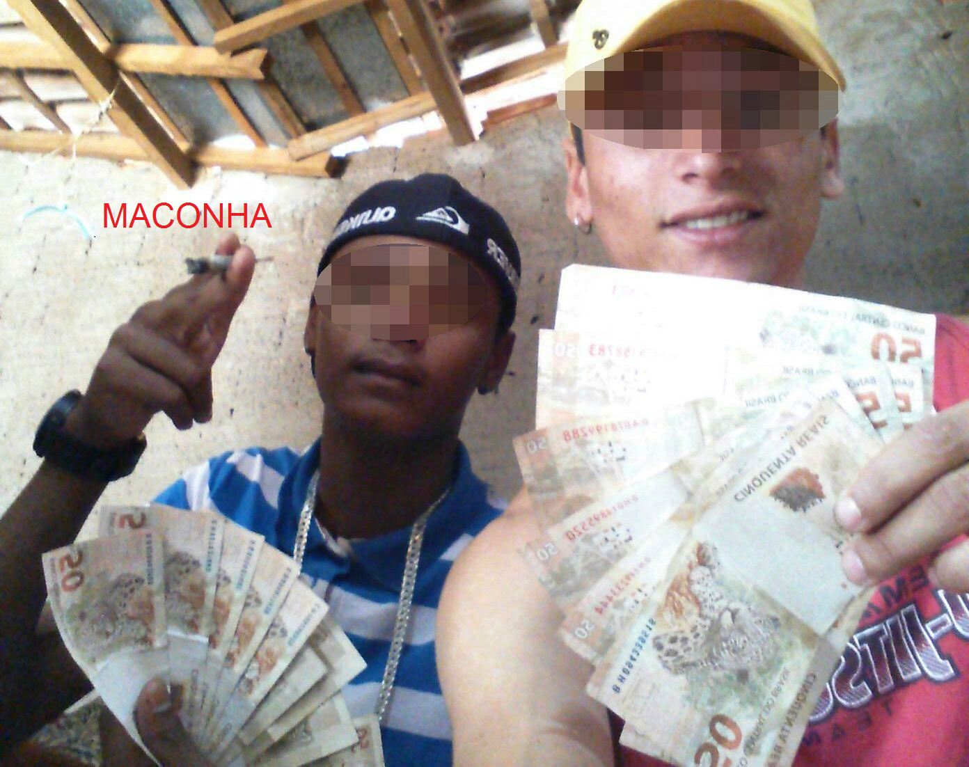Ostentação e muito dinheiro também foram exibidos em fotos em que amigos das garotas aparecem exibindo cédulas de várias notas, provavelmente, produto de algum ilícito. Um deles também foi flagrado fumando um cigarro de maconha, fazendo apologia ao crime.