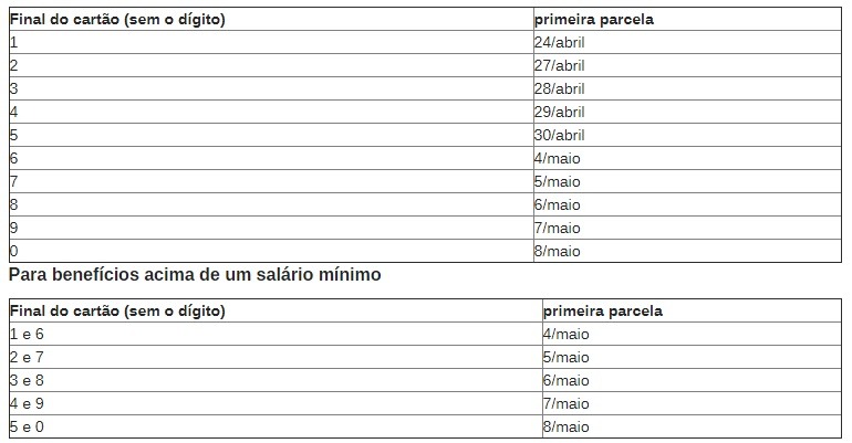• Segurados com renda acima do salário mínimo receberão entre os dias 4 e 8 de maio