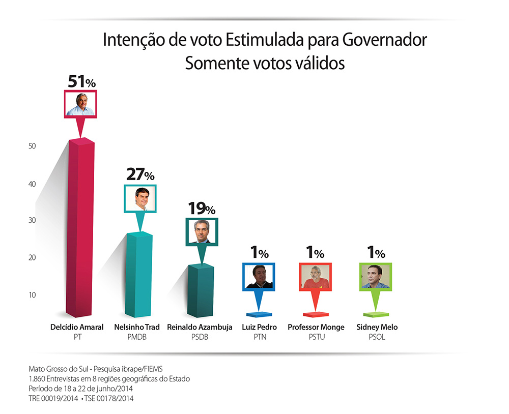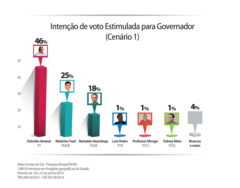 Na pesquisa estimulada, em que são apresentados ao eleitor os nomes de todos os prováveis candidatos, Delcídio aparece com 46%, o pré-candidato do PMDB, Nelson Trad Filho, tem 25%, Reinaldo Azambuja (PSDB) 18%, enquanto os candidatos Luiz Pedro (PTN), Professor Monge (PSTU) e Sidney Melo (PSOL) somaram, cada um, 1%. Neste cenário, os votos brancos e nulos totalizam 4% e o percentual de indecisos também foi de 4%.