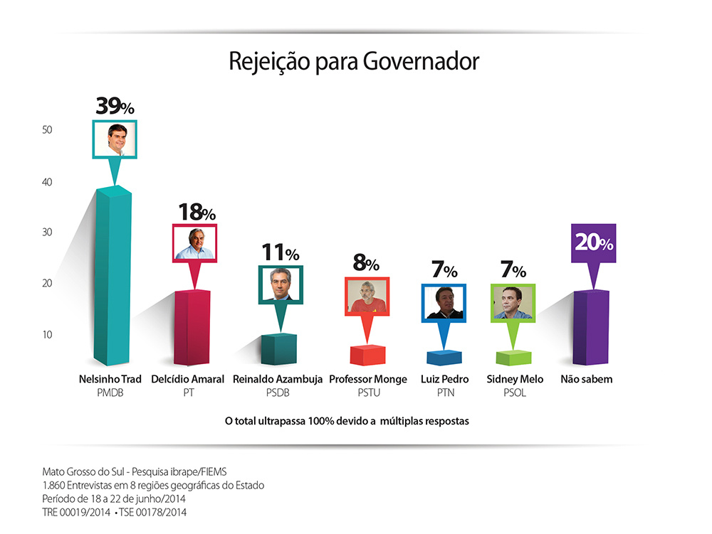 O pré-candidato mais rejeitado pelo eleitor sul-mato-grossense é o ex-prefeito de Campo Grande, Nelson Trad Filho: 39%. Delcídio do Amaral tem 18% de rejeição, Reinaldo 11% e o Professor Monge 8%. Os pré-candidatos Luiz Pedro e Sidney Melo são os menos rejeitados pelo eleitor. Ambos aparecem na pesquisa com 7% de rejeição cada um. 20% dos eleitores não responderam a essa pergunta. A soma ultrapassa 100% em decorrência de alguns dos entrevistados rejeitarem mais de um nome.