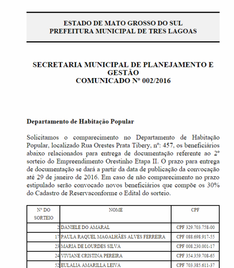 O departamento de habitação de Três Lagoas (MS) publicou ontem no Diário Oficial dos Municípios a solicitação de comparecimento no Departamento, localizado Rua Orestes Prata Tibery, nº: 457, os beneficiários relacionados para entrega de documentação referente ao 2º sorteio do Empreendimento Orestinho Etapa II.
