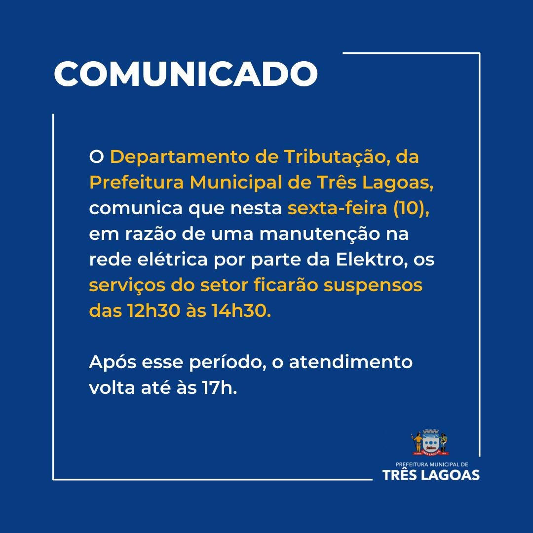 TRÊS LAGOAS (MS) – O Departamento de Tributação, da Prefeitura Municipal de Três Lagoas, comunicou na manhã desta sexta-feira (10) que em razão de uma manutenção na rede elétrica os serviços ficarão suspensos das 12h30 às 14h30.
