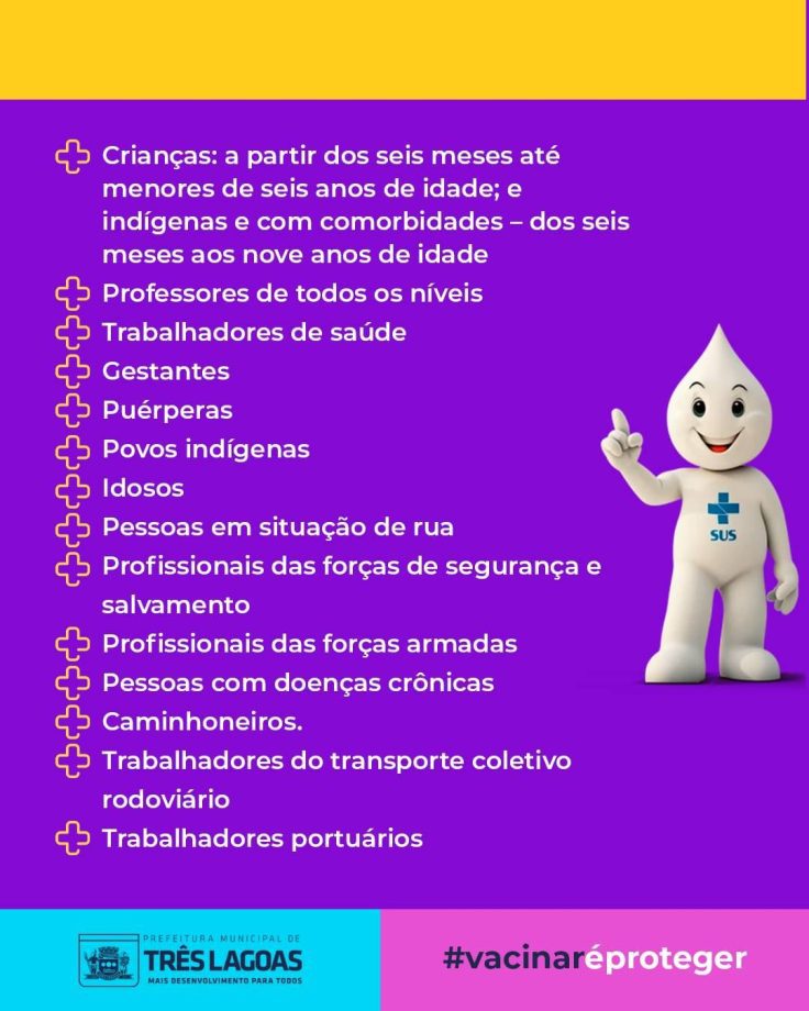 O público-alvo prioritário da campanha são crianças de 6 meses a menores de 6 anos, idosos, gestantes, puérperas e povos indígenas. A meta estabelecida é atingir pelo menos 90% desse grupo, que totaliza 28.552 pessoas em Três Lagoas.