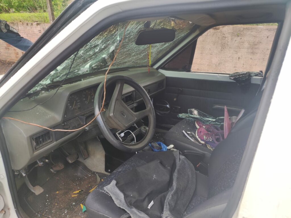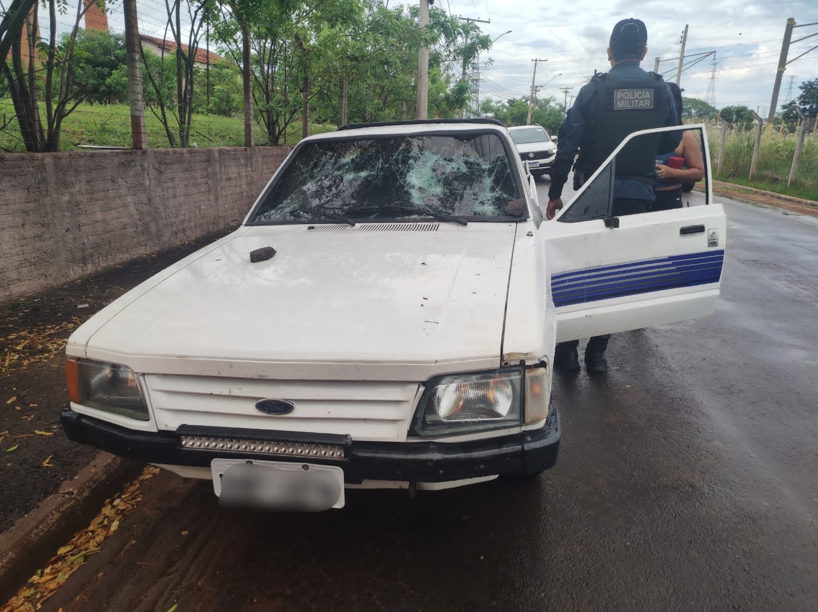Carro teve o para-brisa e o retrovisor quebrado, as portas amassadas e vários danos na lataria devido a uma pedra que foi atirada.