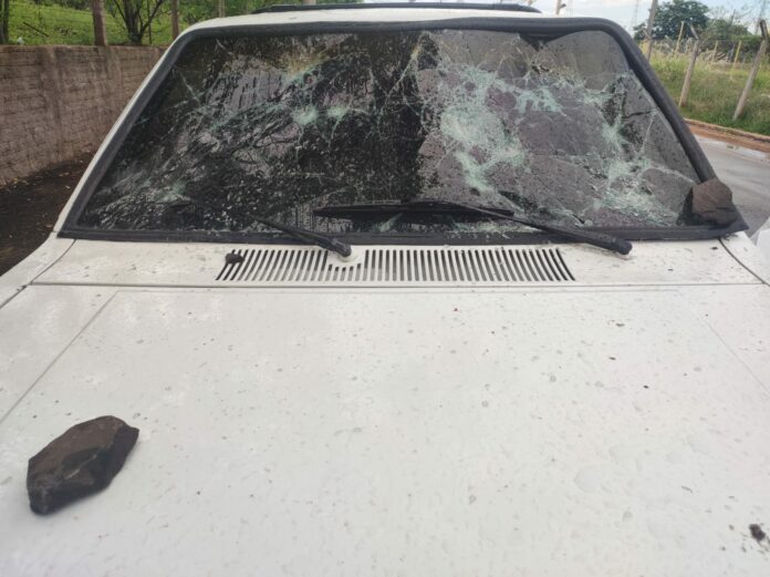 Carro teve o para-brisa e o retrovisor quebrado, as portas amassadas e vários danos na lataria devido a uma pedra que foi atirada.