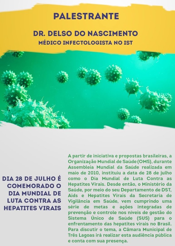 Nesse sentido, conforme divulgado, a Câmara Municipal promove a “Semana de Prevenção às Hepatites Virais”, proposta pela vereadora Isabel Cristina.