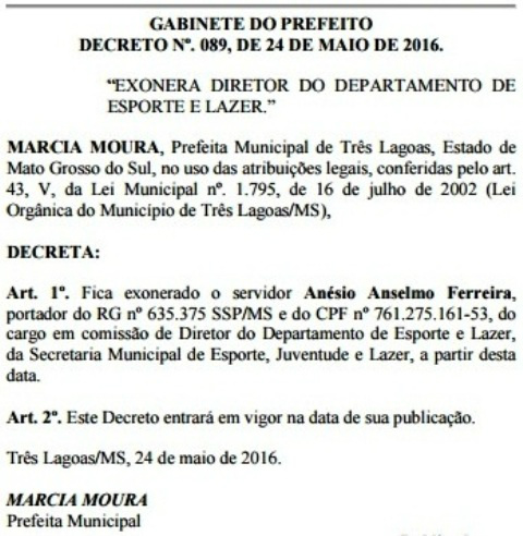 Segundo denúncias feitas na rede social na manhã de ontem (24), dizia que um dos Diretores da SEJUVEL (Secretaria Municipal de Esportes, Juventude e Lazer),Anésio Anselmo Ferreira de Três Lagoas possuía dois cargos distintos, sendo o segundo na cidade de Andradina (SP), na Administração Penitenciária.