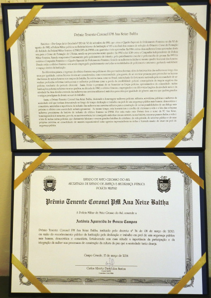 Antonia Aparecida de Souza Campos participou da solenidade em Campo Grande e foi agraciada juntamente com outras nove mulheres civis e integrantes da Polícia com o premio que homenageia os trabalhos humanitários em favor da mulher e contra a violência doméstica.