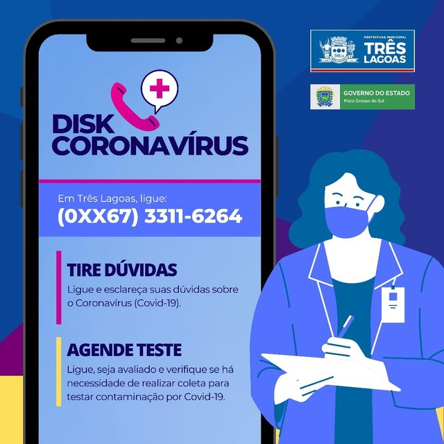TRÊS LAGOAS (MS) – Para agendamento de testes e esclarecer dúvidas sobre o novo coronavírus (Covid-19), os três-lagoenses têm a disposição o número (0xx67) 3311-6264 do Disk Coronavírus. O Disk-Coronavírus Três Lagoas funciona todos os dias da semana, inclusive feriados, das 8h às 18h, cuja estrutura física funciona no CIOPS da Capital.