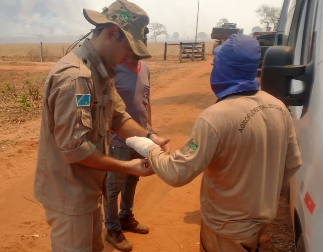 Em imagens divulgadas pela corporação é possível ver que uma pessoa acabou se ferindo durante o combate a um foco de incêndio na fazenda Terra Boa. O homem recebeu os primeiros socorros da equipe militar. Os registros ainda mostraram o fogo se deslocando para proximidade de uma área de preservação ambiental.