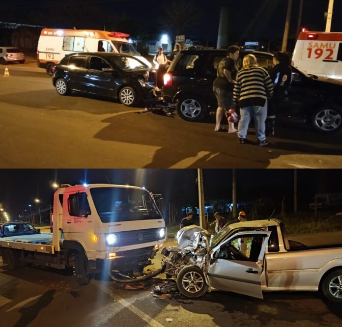 Dois carros e uma moto se envolveram em uma colisão, e logo após, um caminhão guincho colidiu com uma Saveiro no mesmo local.