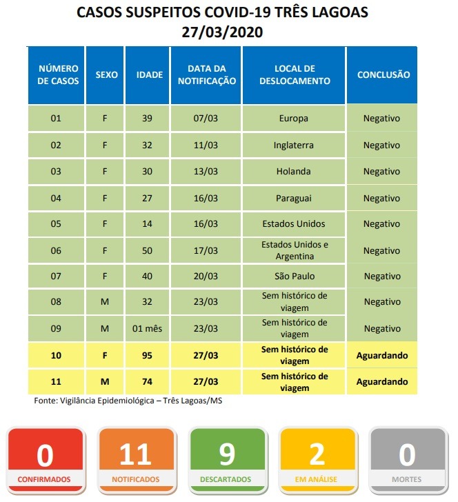 Até o momento, contando com esses dois novos casos, Três Lagoas registrou um total de 11 notificações da doença, mas 9 já foram descartados como negativos. São 7 mulheres com idade entre 14 e 50 anos, a maioria com histórico de viagens internacionais e uma vinda de São Paulo. Dos outros 2 casos, 1 trata-se de um homem com 32 anos e um bebê de 1 mês de vida, nenhum dos dois tinham histórico de viagem.