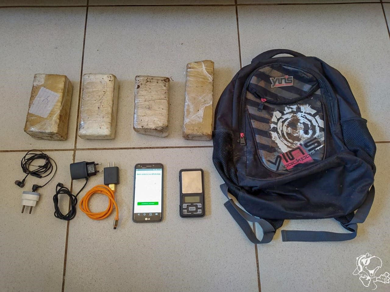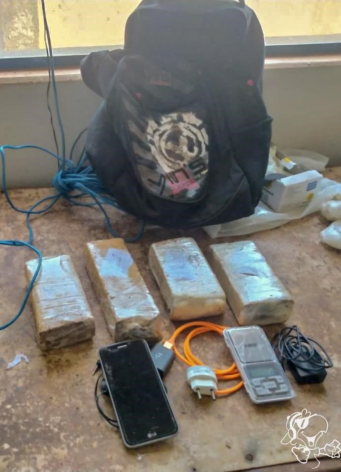 Ao verificarem o conteúdo, os militares constararam que no interior da mochila continha quatro tabletes de substancia análoga a maconha, que pesou aproximadamente dois quilos, 1 aparelho celular, 01 fone de ouvido, 01 carregador e 01 balança de precisão, materiais estes que provavelmente seriam lançados para o interior do estabelecimento penal.