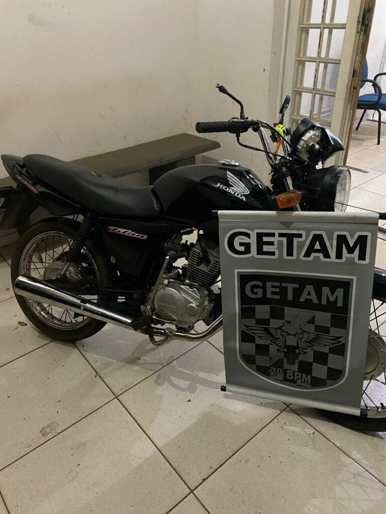 Uma motocicleta Honda Titan de preta, furtada nesta quinta-feira (01), quando estava estacionada na frente de uma residência na Viela Miguel Amado no bairro Vila Nova, foi recuperada na madrugada desta sexta (02) na área central da cidade.