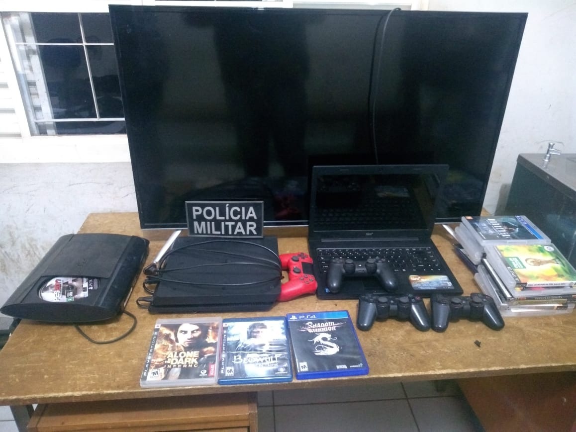Na casa, os policiais encontraram um notebook da marca Positivo, um PlayStation 3, um PlayStation 4, quatro controles e diversos jogos. Segundo levantamento, o material apreendido está avaliado em cerca de R$ 7 mil.