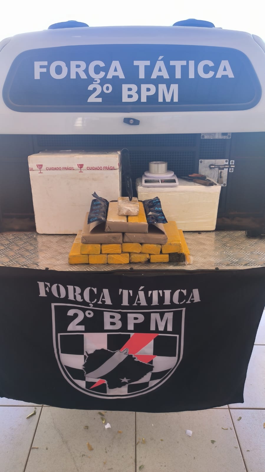 O outro detido, de 23 anos informou que estava ali para entregar uma nota fiscal que estava em seu bolso, além de um celular para o suspeito de 25 anos, onde essa nota seria colocada na caixa que continha as drogas para realizar a remessa pelos correios. Em diligências na residência, localizada há aproximadamente 500m, foram encontrados 10 tabletes de maconha em uma caixa semelhante à encontrada na praça, pesando 7.217kg, além de uma balança e materiais para endolação.