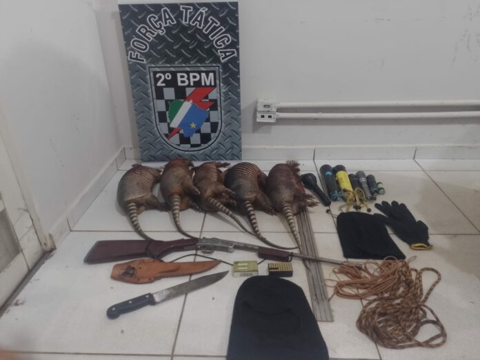 Suspeitos estavam em um veículo, quando foram abordados pela Força Tática, dizendo que estavam praticando caça. Um dos passageiros confessou que no interior do veículo tinha uma espingarda e cinco tatus mortos.