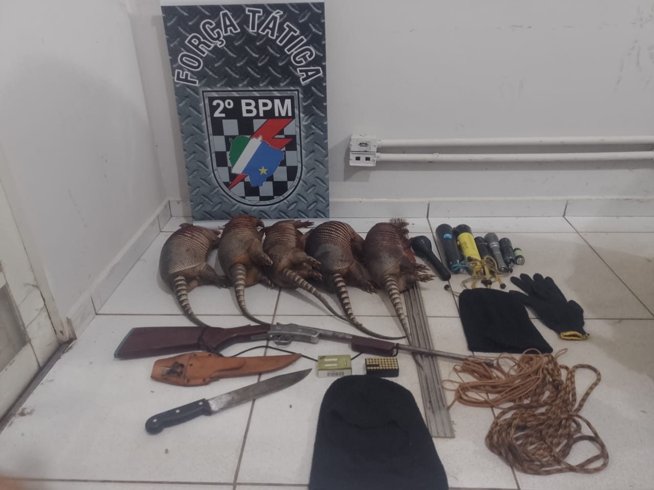 O passageiro do veículo ainda afirmou que uma espingarda calibre .22 e cinco tatus mortos estavam no interior do veículo, e que todos estavam ali para caçar, apontando uma bolsa onde estava a arma e sete munições do mesmo calibre, todas intactas, além de um saco onde estava os cinco tatus abatidos.