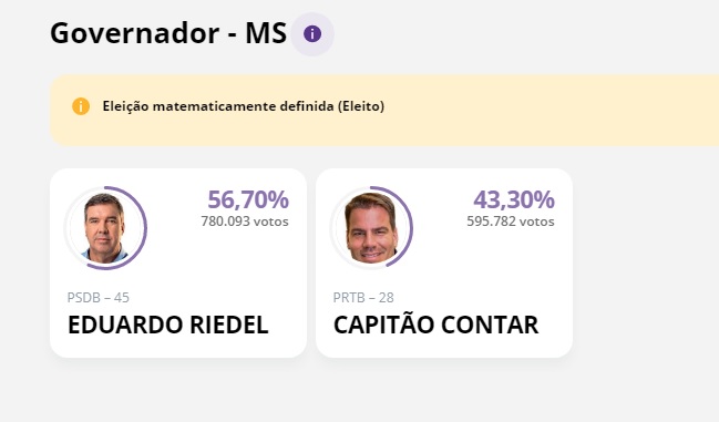 As eleitoras e os eleitores do Mato Grosso Do Sul (MS) elegeram Eduardo Riedel (PSDB) como governador do estado para os próximos quatro anos. Até as 17h30 deste domingo (2), com 96,67% das urnas apuradas, ele havia recebido cerca de 780 mil votos, o que equivale a 56,70% do total de votos válidos. A disputa foi contra o Renan Barbosa Contar, também conhecido como Capitão Contar (PRTB), que obteve cerca de 595 mil votos (43,30%).