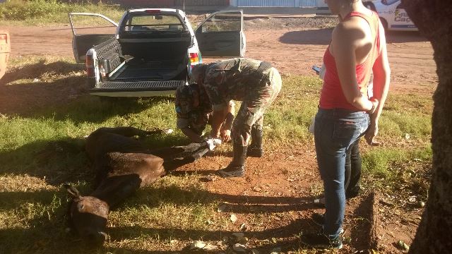 A Polícia Militar Ambiental (PMA) de Três Lagoas resgatou, na tarde desta segunda-feira (28), uma égua bastante desnutrida e doente. O animal estava abandonado e caído na rua Alfredo Castilho, Bairro Santa Rita, há pelo menos cinco dias, de acordo com moradores. O proprietário não foi identificado.