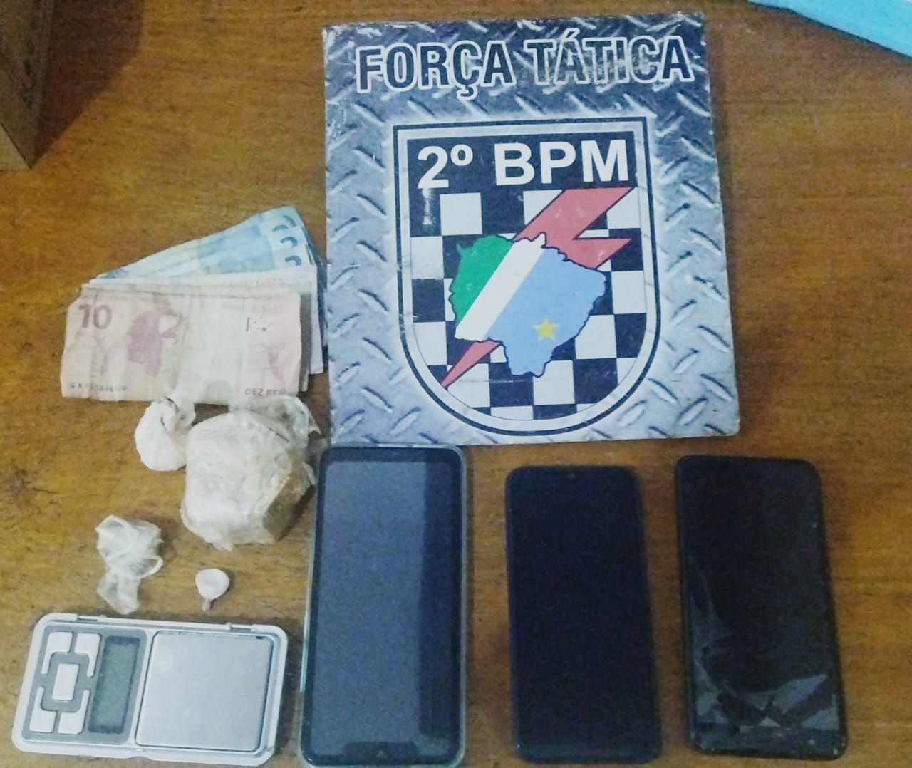 Já no apartamento apontado como usado para o tráfico, foi utilizada a chave encontrada no bolso do suspeito, que ao abri-lo, foi notado que não era habitado, somente localizando uma mesa com um tablete de crack, pesando 109gr, uma trouxinha de cocaína de 10,5gr, e uma balança de precisão, onde confessou aos policiais que a droga era sua, adquirida como pagamento de uma dívida de uma pessoa conhecida como “Robertinho”, que fracionava a droga, e a vendia por peso e preço diverso.