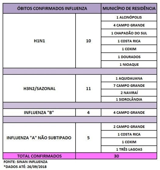 O 28º óbito foi registrado em Sidrolândia, a 71 km de Campo Grande, pelo vírus H3N2/Sazonal. As duas últimas ocorreram em Campo Grande, uma por Influenza B e outra por Influenza “A” não subtipado.