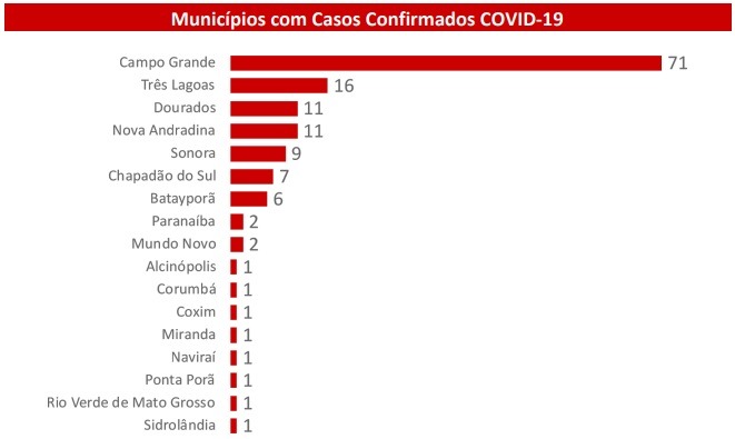 O maior número de casos continua em Campo Grande, com 71 confirmados, Três Lagoas vem em segundo, com 16 casos. Nestes dois municípios, os casos já são comunitários.