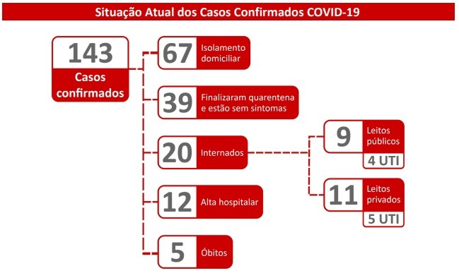 Do total de casos confirmados, 20 estão internados, sendo nove em leitos públicos (com quatro em Unidade de Terapia Intensiva) e 11 em leitos particulares (cinco em UTI). Ao todo, 39 pessoas já encerraram a quarentena, 67 estão em isolamento domiciliar e 12 tiveram alta hospitalar.