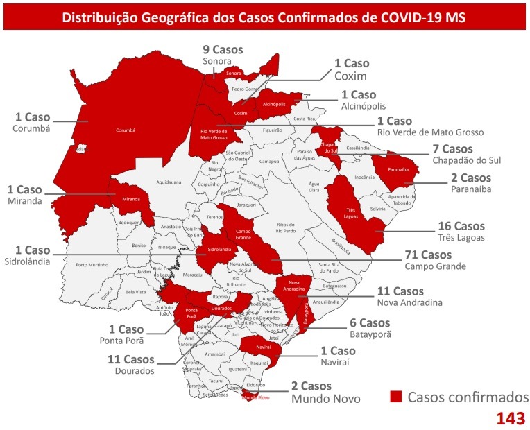Ao todo, o Estado tem 143 casos confirmados, 1.111 notificações, 28 em investigação, 919 descartados, 21 excluídos e cinco mortos pela doença (dois em Campo Grande, um em Três Lagoas, Dourados e Batayporã).