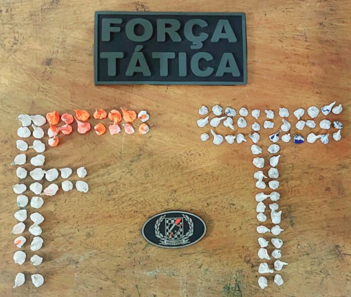 Com os suspeitos, foram encontradas três paradinhas de crack no bolso de um dos usuários, de alcunha “indinho“, pesando 0,8gr cada, assumindo que o entorpecente seria para seu uso. Já nas proximidades, mais especificadamente em uma caixa de um orelhão foram localizadas mais 55 paradinhas de crack pesando 15,2gr, semelhantes aos que foram encontradas com o usuário, além de 45 paradinhas de cocaína, pesando 15gr, onde ninguém assumiu a posse da droga. Diante da situação, “indinho” foi detido por porte de entorpecentes.