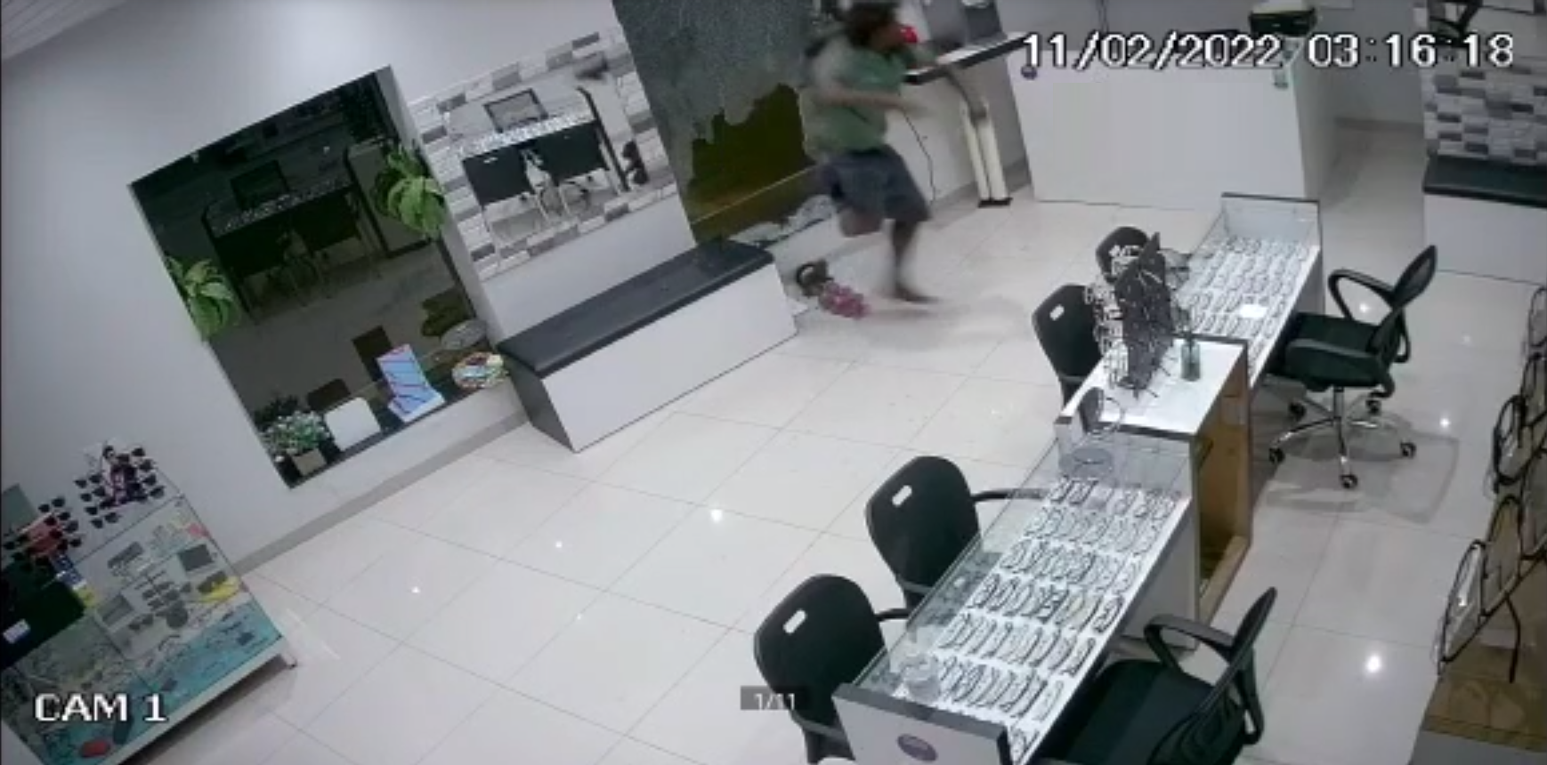 Nas imagens de câmeras de segurança, “Saci” aparece quebrando o vidro e invadindo o comércio, indo até o caixa que ficou danificado, fugindo com alguns objetos e um valor em dinheiro.