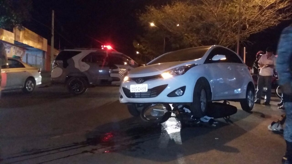 Um acidente de proporções graves foi registrado na rua Márcia Mendes por volta das 20h desta quinta-feira (3). Uma moto foi parar embaixo do carro e foi destruída.
