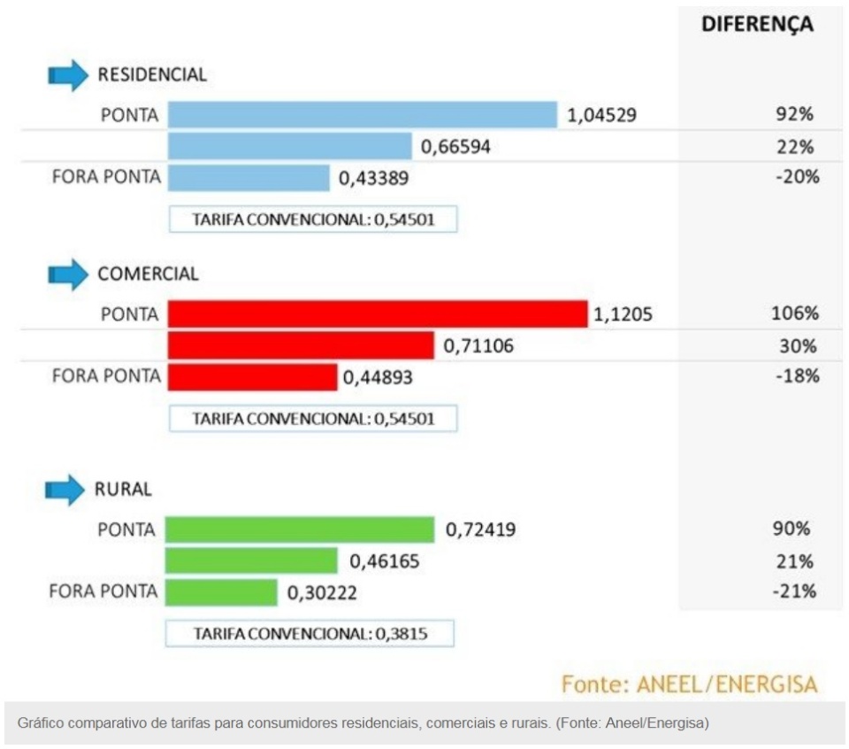 Segundo a Energisa e a Aneel, o uso da tarifa branca, quando respeitados os horários fora de ponta, pode gerar uma economia de até 20%. O gráfico abaixo mostra a variação do custo da energia de acordo com o horário utilizado, tanto para consumidores residenciais, comerciais ou rurais. Por exemplo, o custo do kWh da energia para um consumidor residencial ficaria 92% mais caro se utilizado no horário de ponta, mas ficaria 20% mais barato, se utilizado fora do horário de ponta.