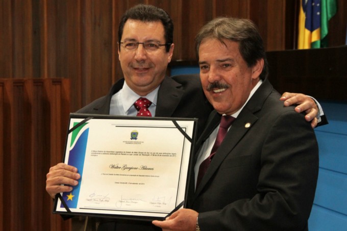 Os empresários Waldemar Locatelli e Walter Gargione Adames receberam títulos de cidadãos sul-mato-grossenses entregues pelo 1º Secretário da Assembleia Legislativa, deputado Antonio Carlos Arroyo (PR), em sessão solene, na noite desta quinta-feira (12). Segundo Arroyo, “essa homenagem é a forma que a Assembleia Legislativa tem de demonstrar a gratidão e o reconhecimento àqueles empreendedores que colaboram, com sua capacidade de trabalho, honestidade, amizade e dedicação, na construção e desenvolvimento de Mato Grosso do Sul”.