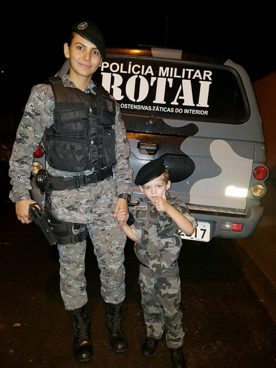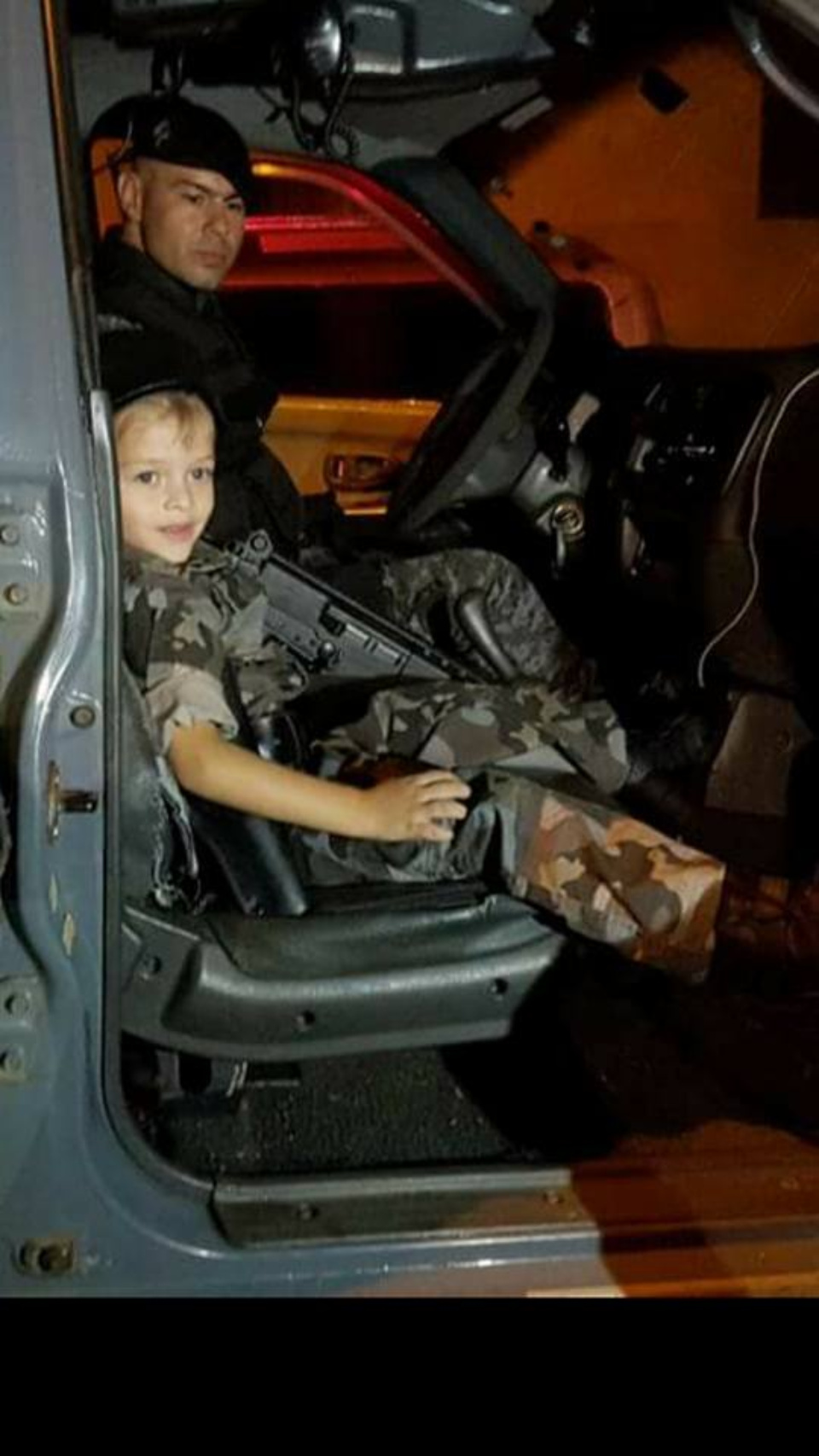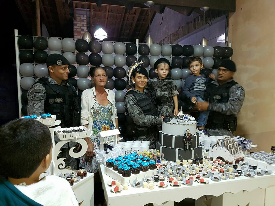 Apaixonado pelos heróis de farda, o três-lagoense Bruno Vinicius escolheu decorar a sua festa de aniversário com as cores camufladas da ROTAI (Rondas Ostensivas Táticas do Interior), se vestiu com o uniforme da corporação, mas o que ele não imaginava é que uma equipe da Polícia Militar participaria de sua festa.