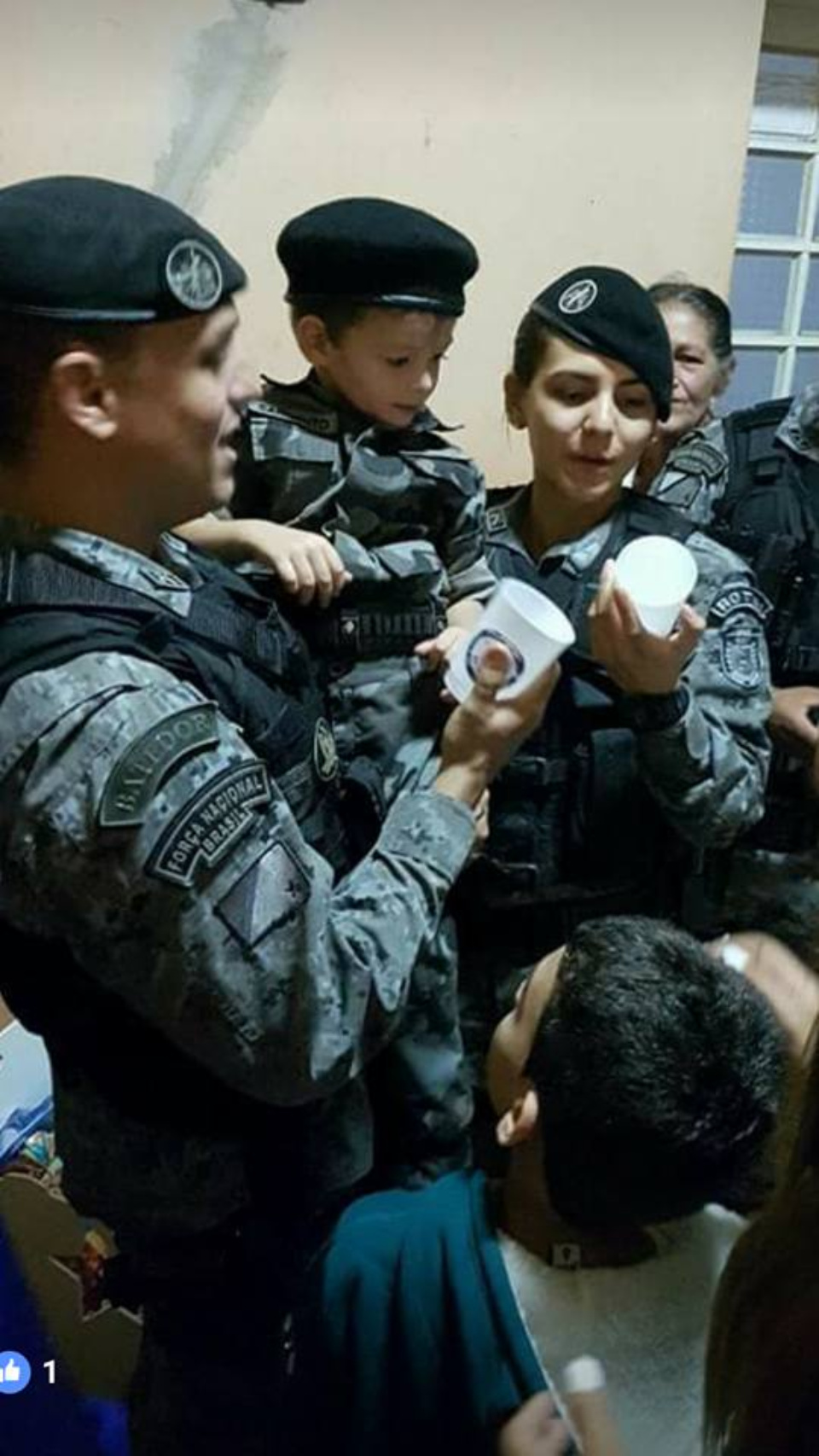 Bruno aproveitou para tirar muitas fotos com seus heróis e no colo da policial militar cantou parabéns ao lado da guarnição e de seus pais.