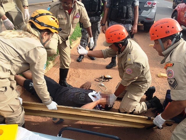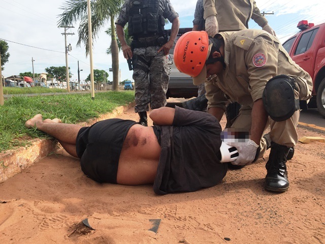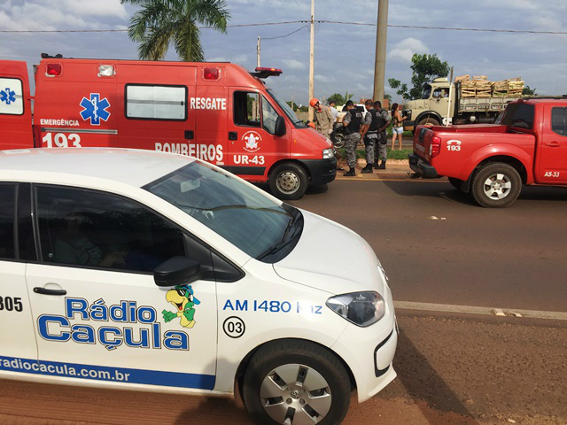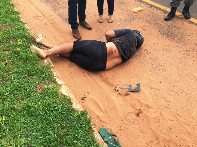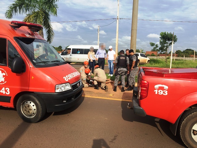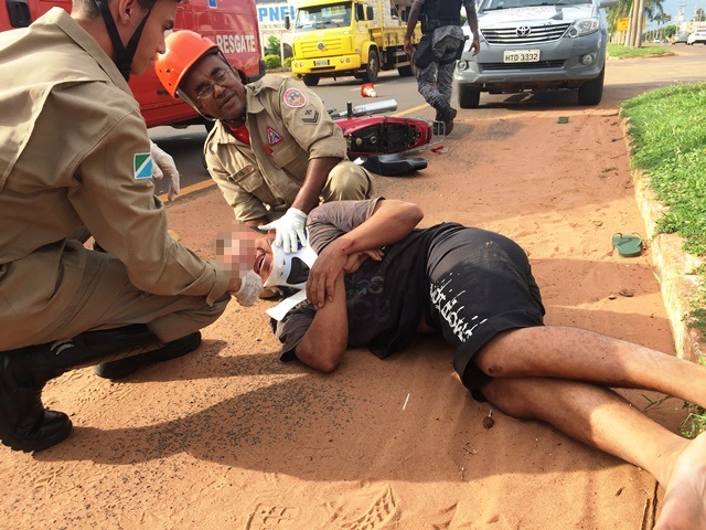 Equipes do Corpo de Bombeiros estiveram no local e socorreram o motociclista de 34 anos com escoriações pelo corpo e dores pelo corpo até a Unidade de Pronto Atendimento (UPA).