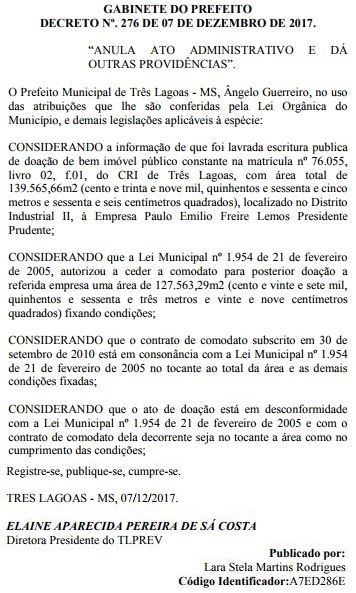A Prefeitura de Três Lagoas retomou uma área de 139.565,66m², no distrito industrial da cidade. O espaço foi cedido para a empresa Paulo Emilio Freire Lemos de Presidente Prudente sob a Lei Municipal nº 1.954 de 21 de fevereiro de 2005, isso porque a organização não cumpriu o prazo para a conclusão e funcionamento do empreendimento. A publicação foi feita no Diário Oficial do Município desta sexta-feira (8).