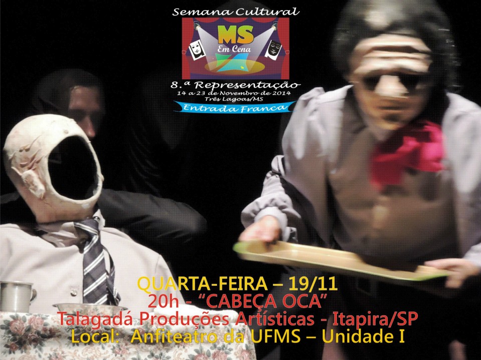 O espetáculo, da Talagadá Produções Artísticas de Itapira/SP, “CABEÇA OCA” será apresentado como único atrativo do dia, nesta quarta-feira, ás 20h no Anfiteatro da UFMS – Unidade I – próximo ao exército. CABEÇA OCA “Cabeça Oca” é uma metáfora às atitudes desprovidas de razão. Trata-se de um espetáculo híbrido, rico em plasticidade que, além de bonecos, utiliza-se de máscaras e vídeo. Com gênero dramático sob a direção de Valner Cintra, o espetáculo tem a classificação indicativa de 14 Anos e duração de 60 minutos. O texto é de autoria do próprio grupo, o elenco é composto pelos atores Danilo Lopes, João Bozzi e Valner Cintra. Conta ainda com a direção musical de Luis Giovelli, sonoplastia João Vitor Ferian, cenário Talagadá Produções Artísticas, iluminação, figurino e maquiagem Valner Cintra. O público interessado em prestigiar o espetáculo deverá retirar os ingressos com UMA HORA DE ANTECEDÊNCIA pois o Anfiteatro comporta 234 lugares.