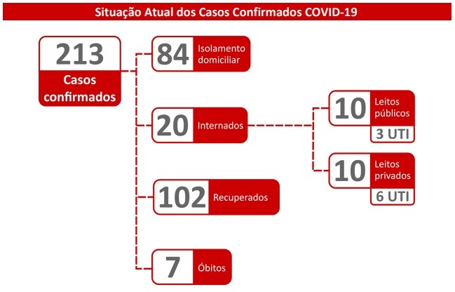 Conforme a Secretaria Estadual de Saúde (SES), já são 213 infectados. Desses, 102 foram declarados curados da doença, seja porque recebeu alta hospitalar, seja porque não teve mais sintomas após quarentena em casa.