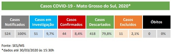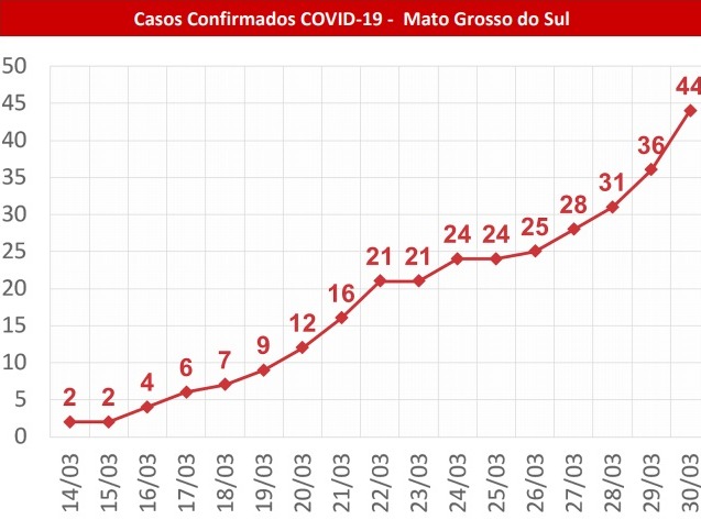 MATO GROSSO DO SUL – O Estado tem 44 casos confirmados para infecção pelo novo coronavírus (Covid-19), segundo boletim divulgado na tarde desta segunda-feira (30) pelo governo. A maioria dos casos concentra-se em adultos em faixa etária jovem, entre 29 a 49 anos, segundo a secretária adjunta, Crhistinne Cavalheiro, alertando para a curva ascendente de casos.