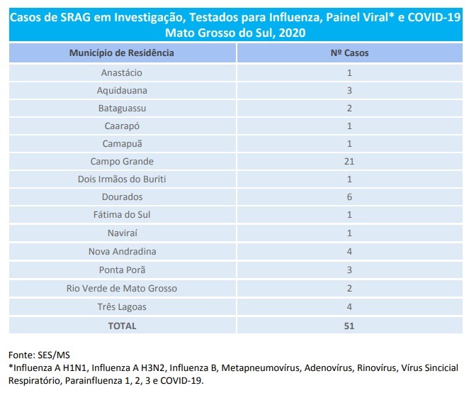 Em Campo Grande, com 36 casos positivos para Covid-19, é a cidade com o maior número de casos do Estado, possuindo sete casos a mais do que o boletim de ontem (29). Batayporã possui 3 casos confirmados seguida por Dourados com 2 casos, Sidrolândia com 1 caso, Rio Verde de Mato Grosso com 1 caso e Ponta Porã com 1 caso. Até o momento não houve registro de óbito.