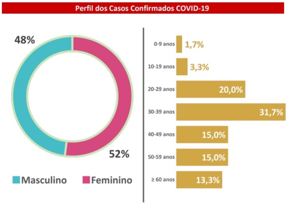 Com relação ao perfil dos contaminados, 48% são homens e 52% mulheres. A maioria dos casos positivos tem entre 30 e 39 anos (31,7%), seguidos por adultos de 20 a 29 anos (20%). Idosos (acima de 60 anos) correspondem a 13,3% dos casos confirmados.