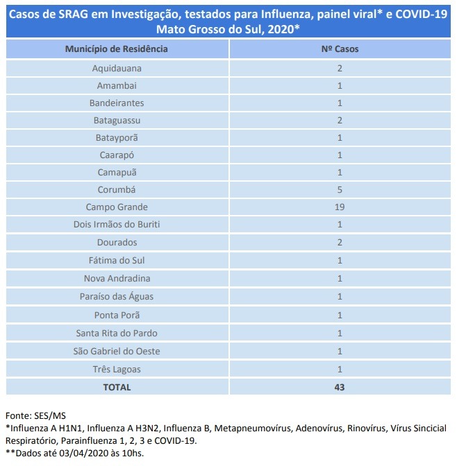 Quanto aos casos suspeitos, a Capital tem 19 aguardando o resultado do exame, enquanto Corumbá tem cinco. Aquidauana, Bataguassu e Dourados têm um caso cada. Amambai, Bandeirantes, Batayporã, Caarapó, Camapuã, Dois Irmãos do Buriti, Fátima do Sul, Nova Andradina, Paraíso das Águas, Ponta Porã, Santa Rita do Pardo, São Gabriel do Oeste e Três Lagoas têm um caso sob investigação.